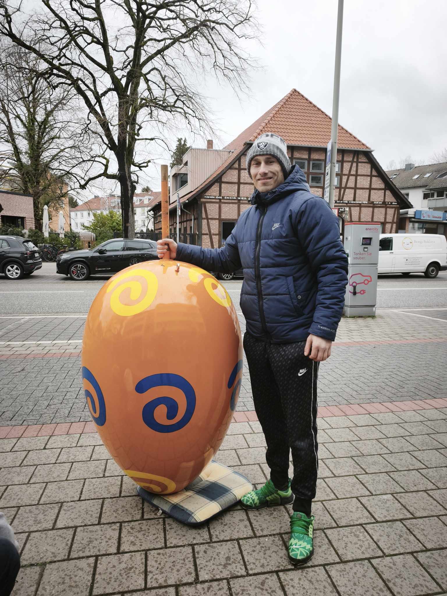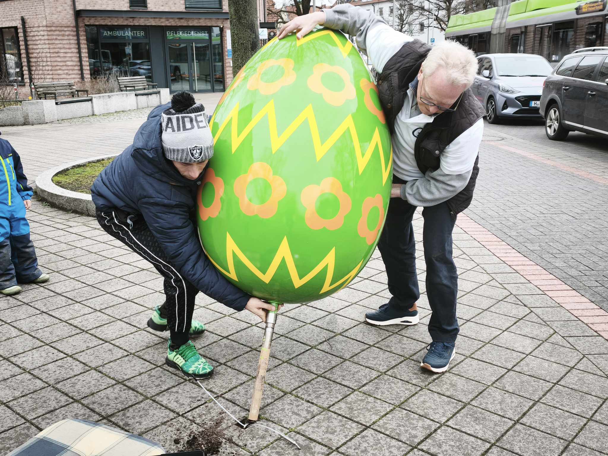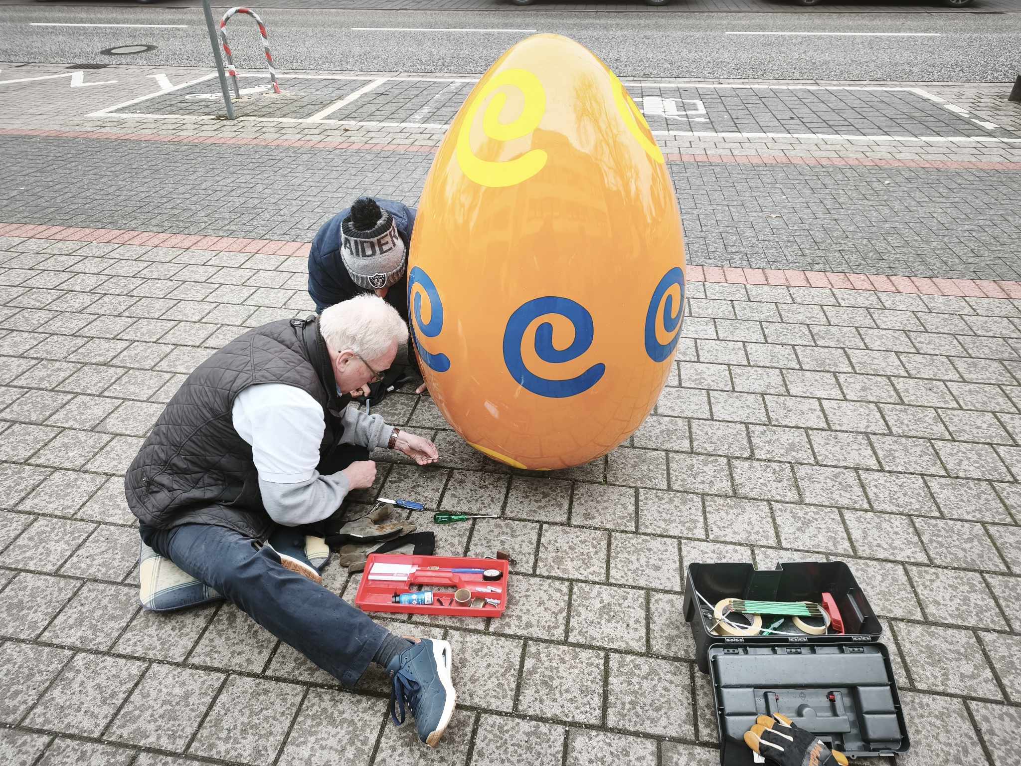 Das Wetter hat gestern nicht mitgeholfen. Die gute Laune schon. Und das ist vielleicht das Bemerkenswerteste an der ganzen Aktion: Trotz Nieselregen und grauem Himmel war die Stimmung gut. Man sieht es den Fotos an. Sobald die Sonne endlich wieder zeigt, was sie kann, werden die leuchtenden Farben der Eier die Brabeckstraße in ein ganz anderes Licht tauchen. Drei große, bunt bemalte Ostereier mitten im Stadtteil, das ist kein dezentes Ausrufezeichen. Das ist ein Statement. Und ein freundliches dazu.
